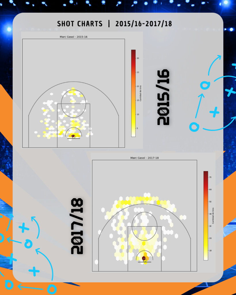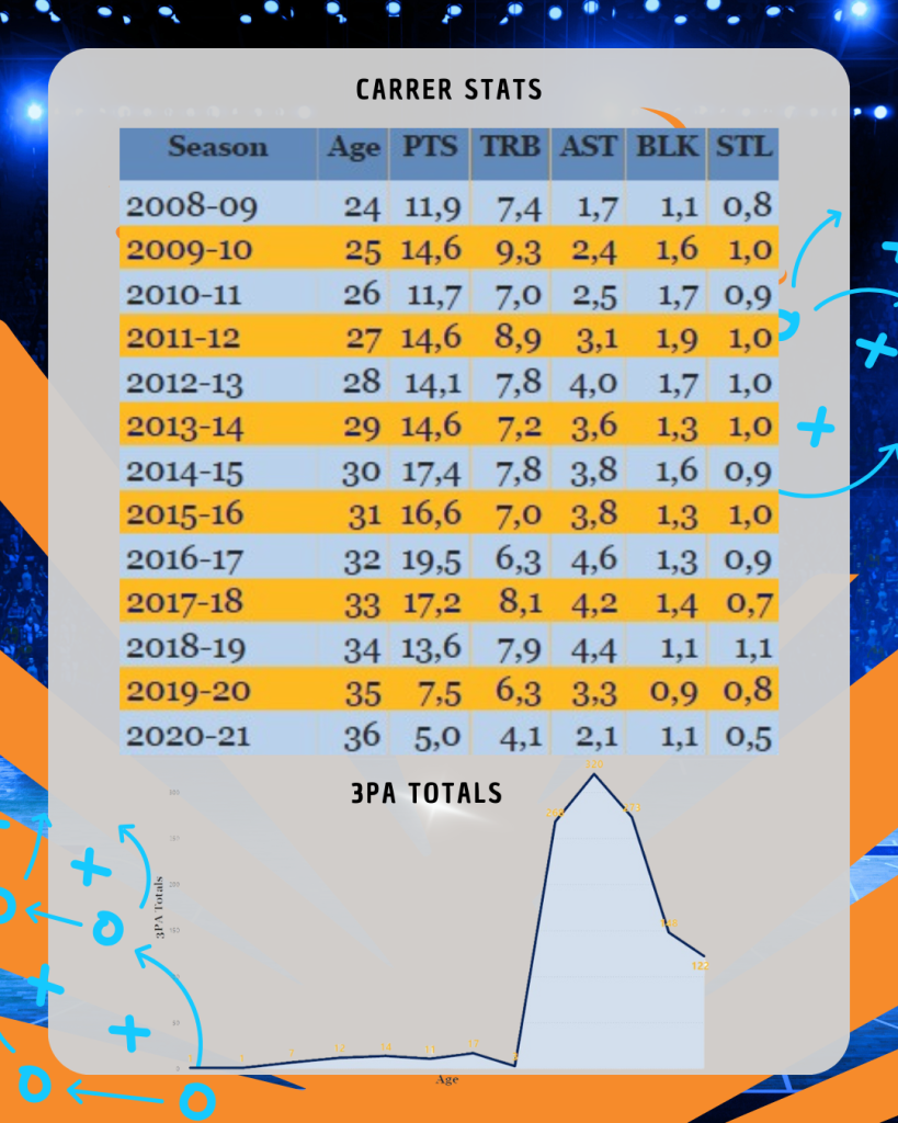 Entre 2008 y 2015 apenas intentaba triples: era un pívot de fundamentos, de media distancia, de juego asociativo. Pero a partir de la temporada 2016-17, su transformación fue evidente: pasó de lanzar 0,1 triples por partido a más de 3 intentos, alcanzando un acierto superior al 38% en su mejor año. Un cambio radical para un jugador consolidado, veterano y con un estilo ya definido.