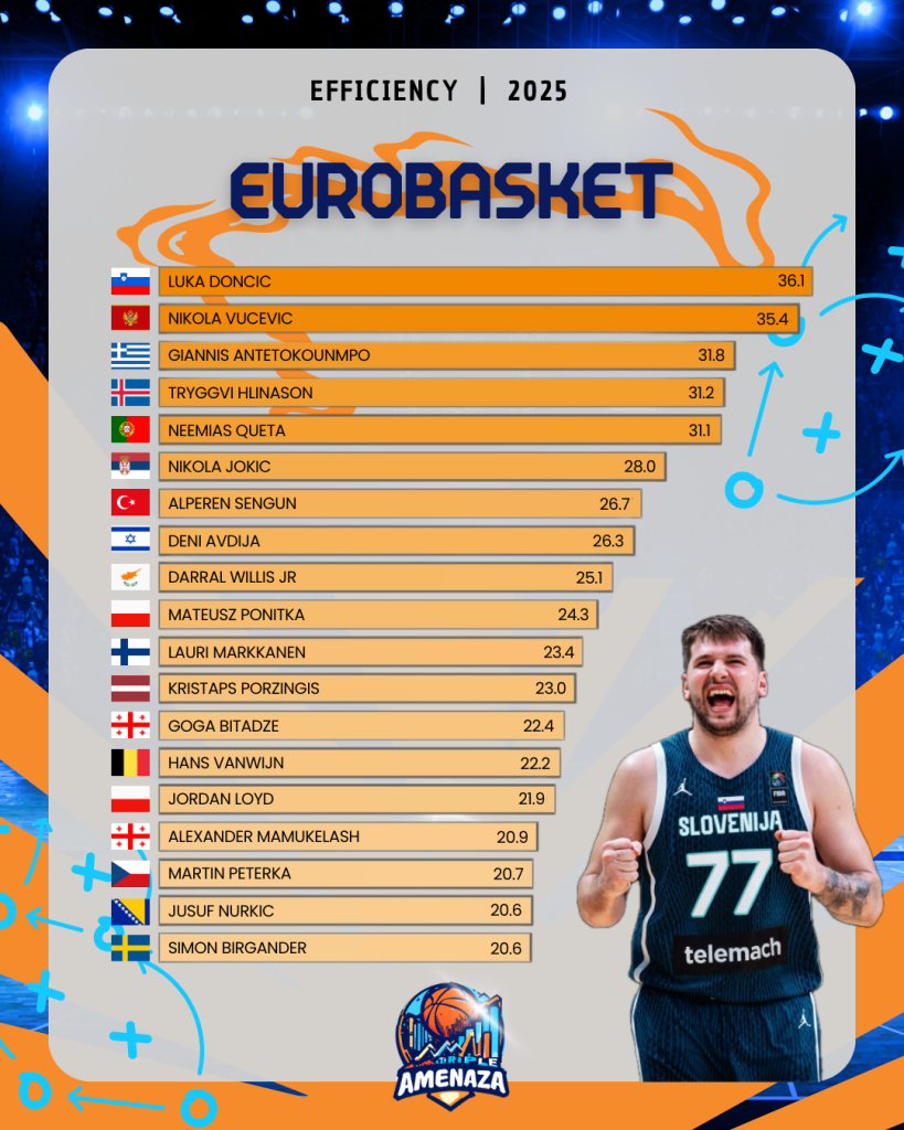 In this chart, we went beyond just showing the top players’ efficiency at EuroBasket 2025. We also measured what percentage of their team’s total efficiency each player contributes.