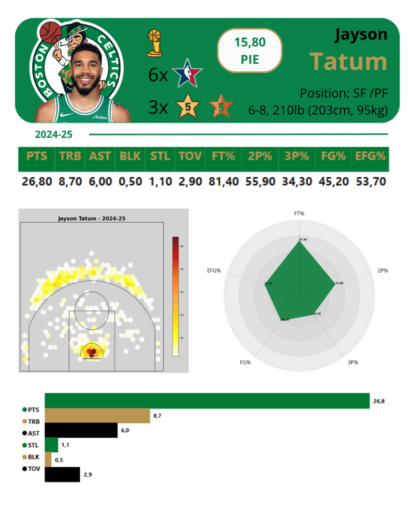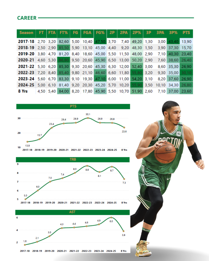 A versatile player, natural leader of the Boston Celtics, and one of today’s most consistent NBA stars, Tatum’s impact goes far beyond the stat sheet—but understanding his numbers helps us truly appreciate his greatness.